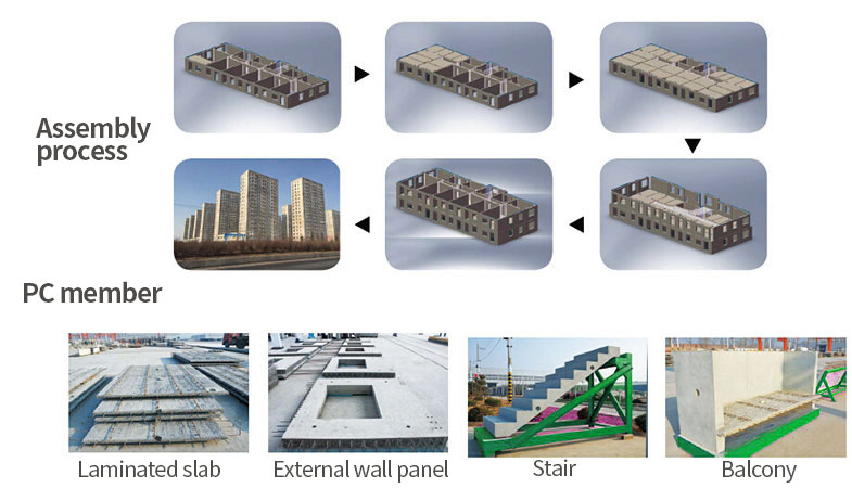 The assembling of PC wall panels means connecting them together to form a structure with cast-in–situ-concrete; the structure is usually cast–situ-concrete or precast and cast-situ hybrid concrete structure. Commonly used PC products includes shear wall (exterior wall panel and interior wall panel), laminated floor slab, partition wall, stairs, balcony and so on.
