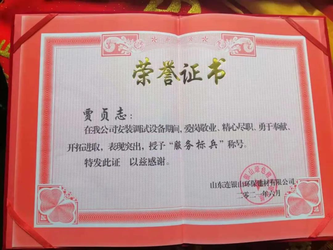 炎炎夏日,天意機(jī)械在向客戶山東連銀山環(huán)保建材有限公司售出保溫裝飾一體化板生產(chǎn)線之后,隨即派出售后團(tuán)隊(duì)對(duì)設(shè)備進(jìn)行安裝調(diào)試及售后培訓(xùn)。售后團(tuán)隊(duì)不畏酷暑,精心、耐心、專(zhuān)業(yè)地為客戶進(jìn)行安裝調(diào)試,贏得了客戶的好評(píng)和認(rèn)可,客戶為表達(dá)謝意,特授予天意機(jī)械售后人員榮譽(yù)證書(shū)和錦旗,以表彰售后人員愛(ài)崗敬業(yè)、精心盡職、勇于奉獻(xiàn)、開(kāi)拓進(jìn)取的精神。