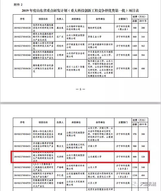 天意機(jī)械面向裝配式建筑的混凝土預(yù)制構(gòu)件智能化生產(chǎn)線的研發(fā)與應(yīng)用項(xiàng)目列入2019年山東省重點(diǎn)研發(fā)計(jì)劃,總計(jì)資金支持800萬元。
